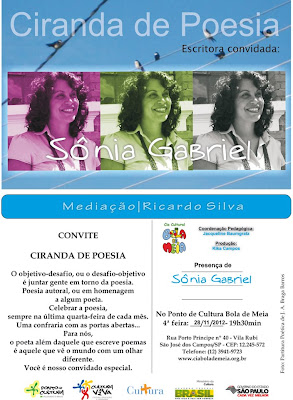 Na terceira edição do Sarau, as mulheres homenageadas serão Ruth Guimarães, de Cachoeira Paulista; Irmã Olga de Sá, de Lorena; Olivia Alegri, de Caçapava; Conceição Molinaro, de Taubaté; e Angela Savastano, de São José dos Campos, todas com ampla atuação no cenário cultural valeparaibano. O evento também conta com a participação especial da escritora Zenilda Lua do projeto Poesia no Prato, como Mestre de Cerimônia, e com a participação do projeto Santo de Casa – Tecnologias Populares, com a exposição Poesias Artesanais, apresentando as figuras de barro de Luiz Paulo Ragazini e Luciana Melo.